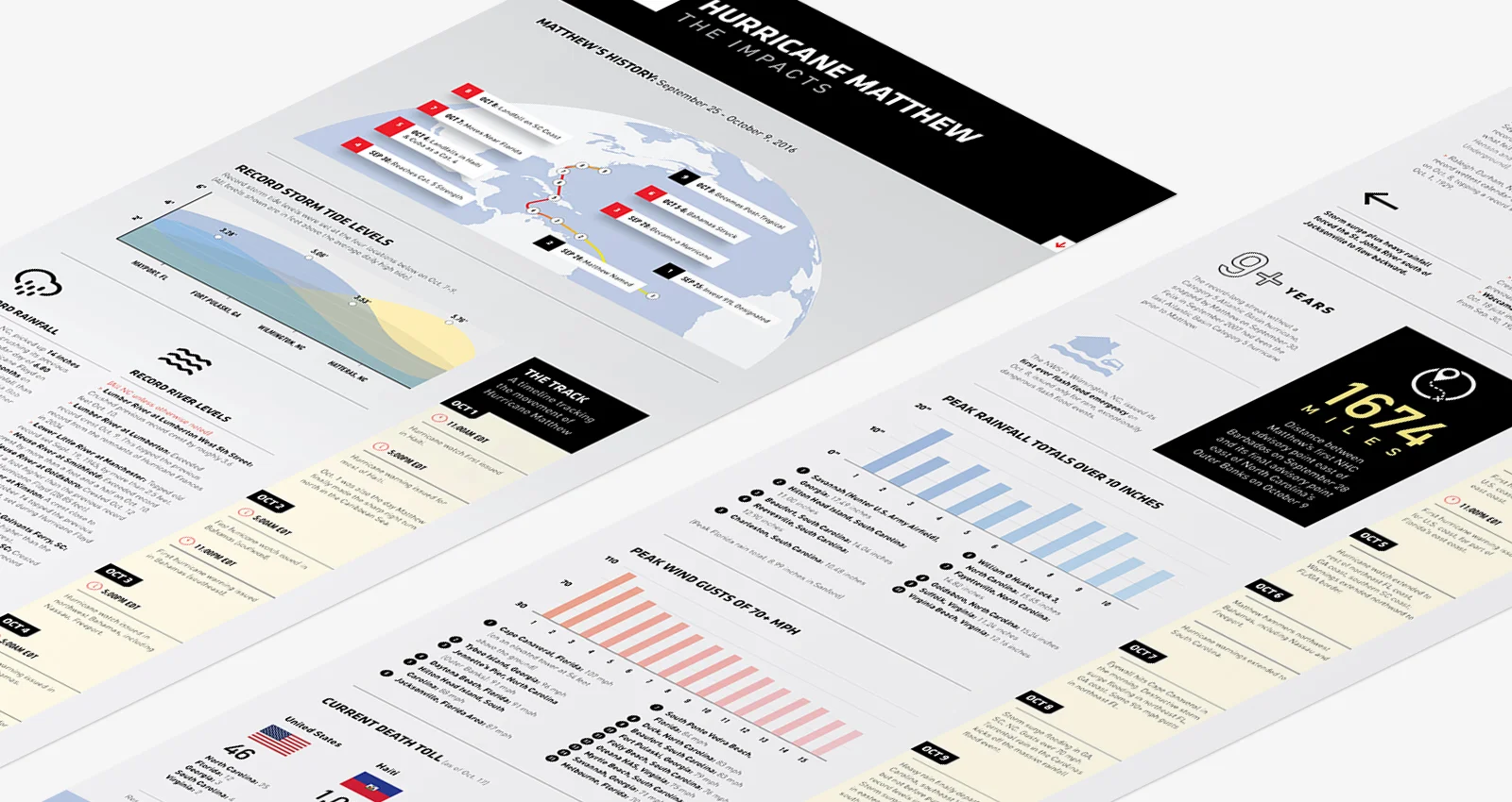 Shortly after Hurricane Matthew devastated the United States Eastern Seaboard, the Weather Channel compiled their data on the storm and asked me to design an infographic highlighting major events in the timeline, key statistics, and damage reports from across the state. The final piece was presented in digital form as a feature within the Hurricane Matthew storm series. View the final infographic here.