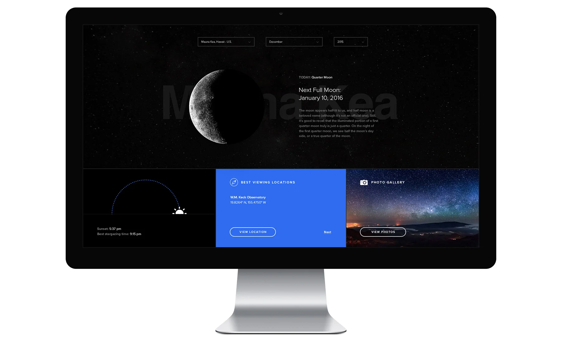 The Weather Channel asked me to provide initial art direction and concept design for a Stargazing microsite that they eventually launched in the Spring of 2016. The goals were to create the visual style, lay out concepts for interaction and animation, and provide UX recommendations for certain sections of the site.